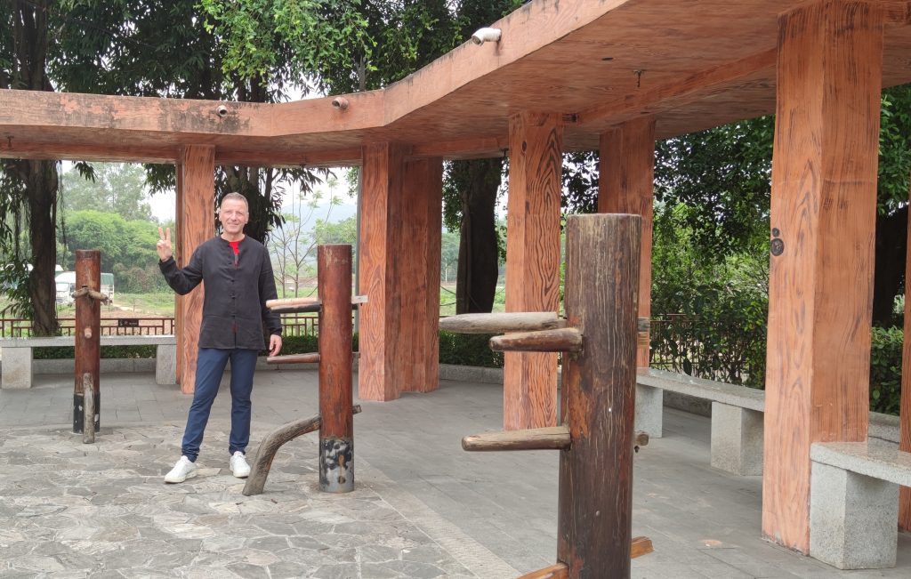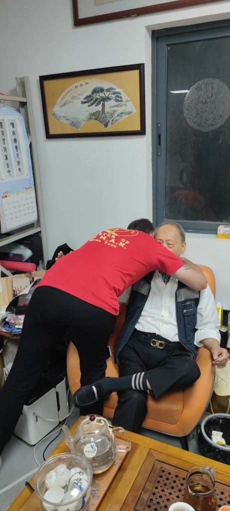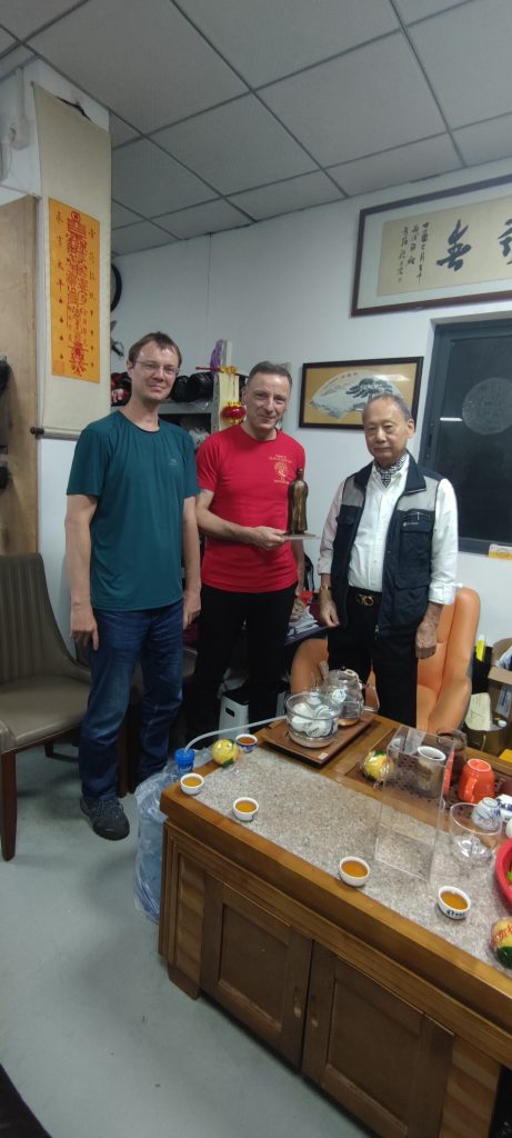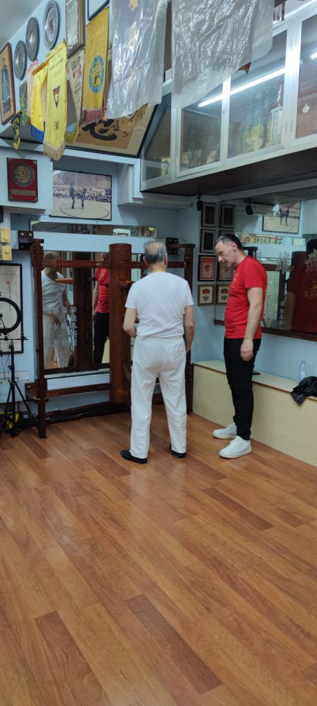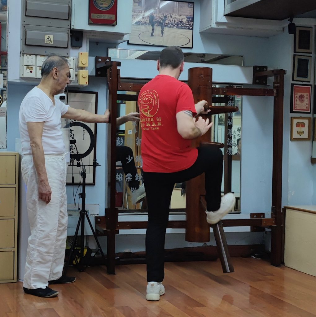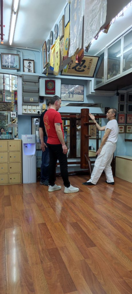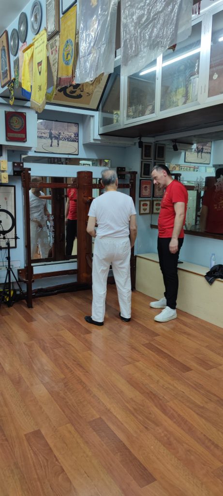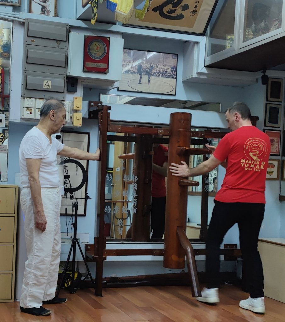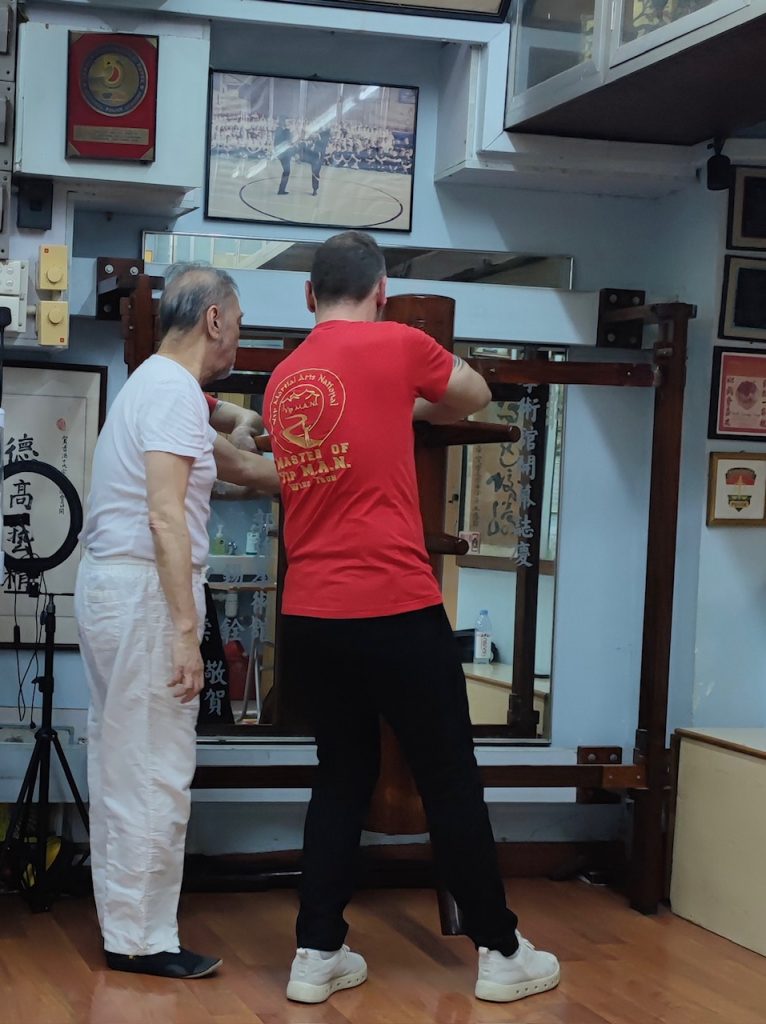 Ich habe einen sehr offenen und gastfreundlichen Großmeister angetroffen der mir die Gelegenheit gab, viele Fragen zu stellen. Wir haben uns so gut verstanden, dass wir bis in den Abend zusammen saßen und über die Techniken, Werte und Philosophien der Kampfkunst Wing Tsun sprachen. Ich nutzte die Gelegenheit ihn zu fragen, ob er sich meine Bewegungen aus der Holzpuppe anschaut. Nach kurzem zögern stimmte er zu und ich durfte meine Holzpuppenform vorführen. Bei der Holzpuppe handelt es sich im Wing Tsun um eine Form, die an einem traditionellen Trainingsgerät ausgeführt wird. Sie zählt zu der letzten waffenlosen Form im Wing Tsun System.