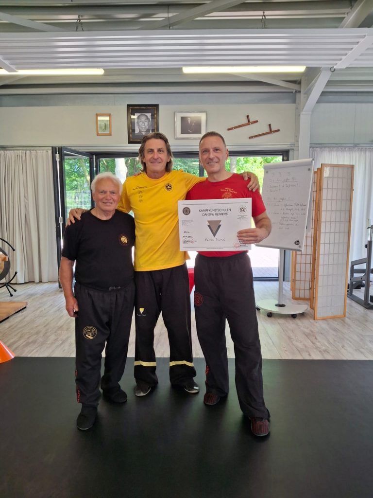 Gegen Ende gab es dann eine Überraschung von Seiten des Großmeisters Hans-Jörg Reimers. Nach einer kleinen Ansprache übergab er unserem Sifu Mario eine Urkunde und ernannte ihn damit zum Dai-Sifu. Das war eine ganz besondere Ehre, die ihm da zuteil geworden ist. Sifu Mario hat seinen Lebensweg dem Wing Tsun gewidmet und unterrichtet seit vielen Jahren Kinder, Jugendliche und Erwachsene im Wing Tsun. Er hat viele seiner Schüler in den höheren Techniker-Programmen ausgebildet und es gibt viele Ausbilder in seinem Team. Die Verleihung des Titels Dai-Sifu ist eine schöne Anerkennung und Würdigung seines Lebenswerkes.